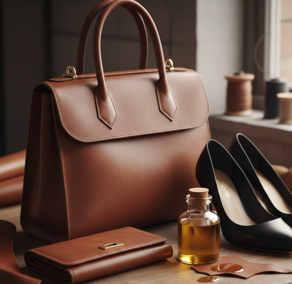 الجو العام: الجو العام للصورة هادئ، يركز على جودة ومتانة الجلد، ويعرض الزيت كمنتج أساسي للحفاظ على هذه القطع الفاخرة.