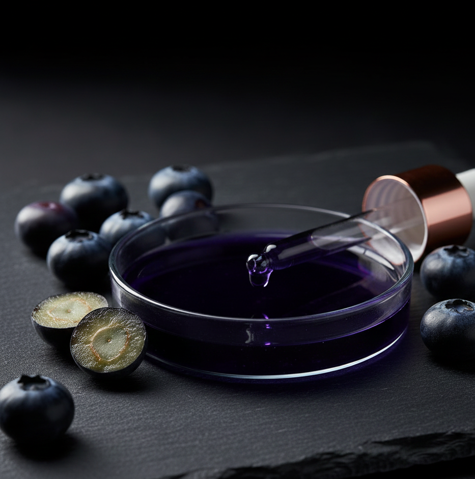 مستخلص التوت الأزرق غني بمركبات الأنثوسيانين وفيتامينات A و C و K و E، ويُعد دفاعاً متقدماً ضد الشيخوخة والإجهاد التأكسدي والضرر البيئي.