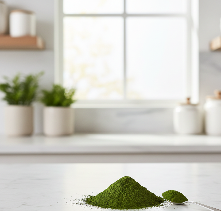 المظهر مسحوق ناعم بلون أخضر غامق ونابض بالحياة.